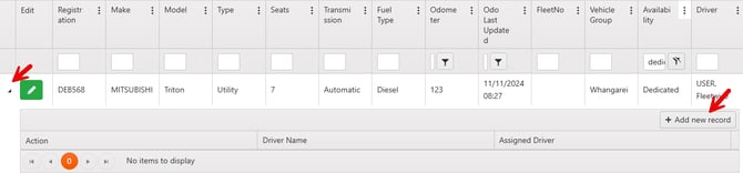 On the maintain vehicles page, find the vehicle you would like to assign drivers using filters. Click on the triangle button to open the assign driver window. Note. this button will only be available for dedicated and private vehicles.