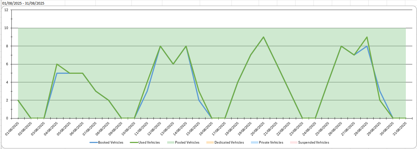 - Allowing users to interpret whether a group could operate with fewer vehicles without affecting service delivery. For example, if only 9 out of 10 vehicles were booked and used at the busiest day for the reported month, then 9 vehicles may suffice.